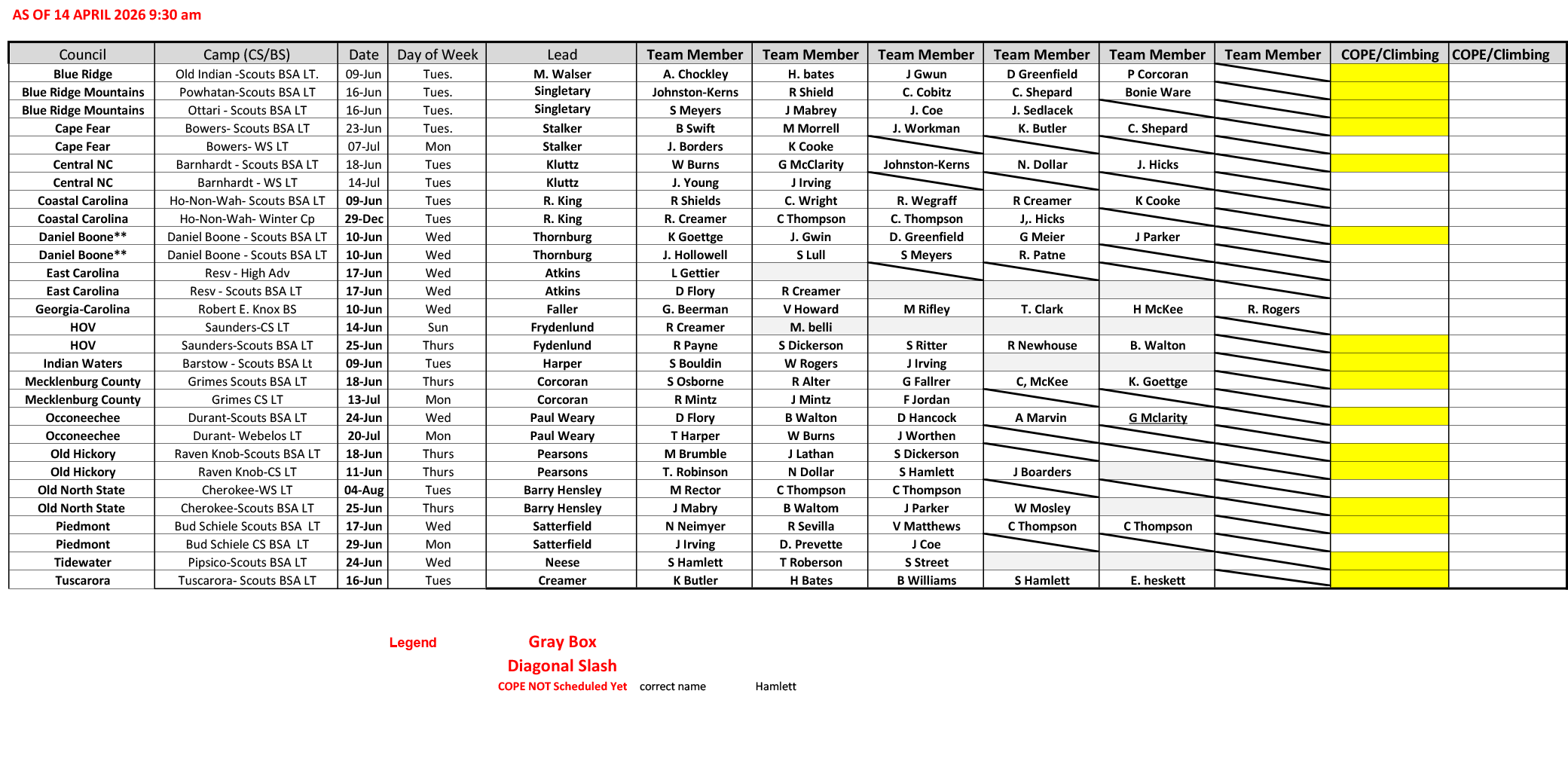 | Council | Camp (CS/BS) | COPE/Climbing | Date | Day of Week |